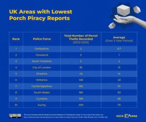 In contrast, regions of the UK with the lowest parcel theft rates only average between 1-15 reported thefts per year. Derbyshire has the lowest rate, with only two thefts reported since 2023, while Cleveland and North Yorkshire follow closely behind.
